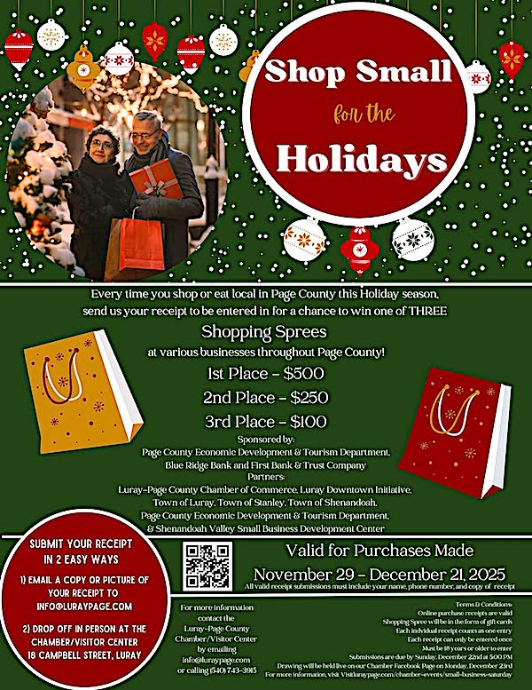~ Press release provided by Luray-Page County Chamber of Commerce PAGE COUNTY, Va. — The “Shop Small in Page County” campaign returns, a collaborative effort once again between the Luray-Page County Chamber of Commerce, County [...]