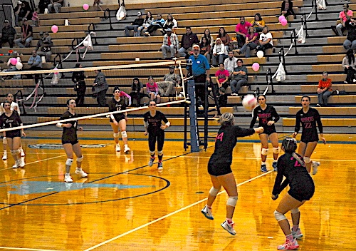 SHENANDOAH, Oct. 24 — The Page County Panthers donned black uniforms with pink numbers and honored special guests prior to Thursday night’s rivalry game with Luray to bring attention to Breast Cancer Awareness Month. Members of the Panthers’ volleyball team handed out flowers to various guests battling breast cancer, and Principal David Cale read the stories of several local cancer survivors, as well as a few stories about those who have succumbed to the disease.