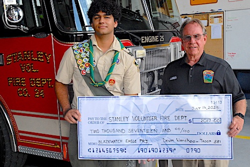 STANLEY, July 14 — On Monday, Devin Wanchoo made the trip from Gainesville to present Stanley Volunteer Fire Department President Terry Pettit with his completed Eagle Scout project. The year-long effort by the Prince William County boy scout was sparked by the wildfires that scorched more than 7,200 acres in the Page Valley in March of 2024.