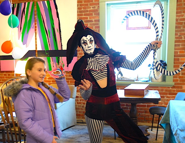 The Luray Downtown Initiative‘s Mardi Gras celebration this past weekend featured New Orleans-style cuisine at local eateries and four stations for making festive Mardi Gras masks. Chloe Price, 10, of Luray holds up a mask she made at the Art Warehouse on Saturday, as she poses with one of the costumed staff members.