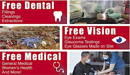 • Free Vision — eye exams, glaucoma testing, eye glasses made on site;