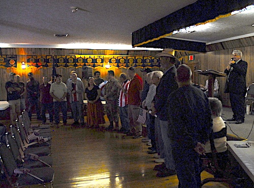 After a prayer and the presentation of colors, Monica Brewer sings the national anthem. Mayor Lucas then speaks about the banners placed outside recognizing the fallen soldiers honored at previous memorial services, and the 23 white crosses near the entrance bearing the names of the fallen from the Town of Shenandoah.