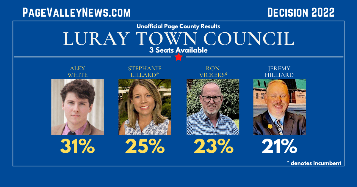 Vickers earned 768 votes to capture the third and final open seat on the Luray Council. The other challenger in the four-way race, Jeremy Hilliard, tallied 705 votes.